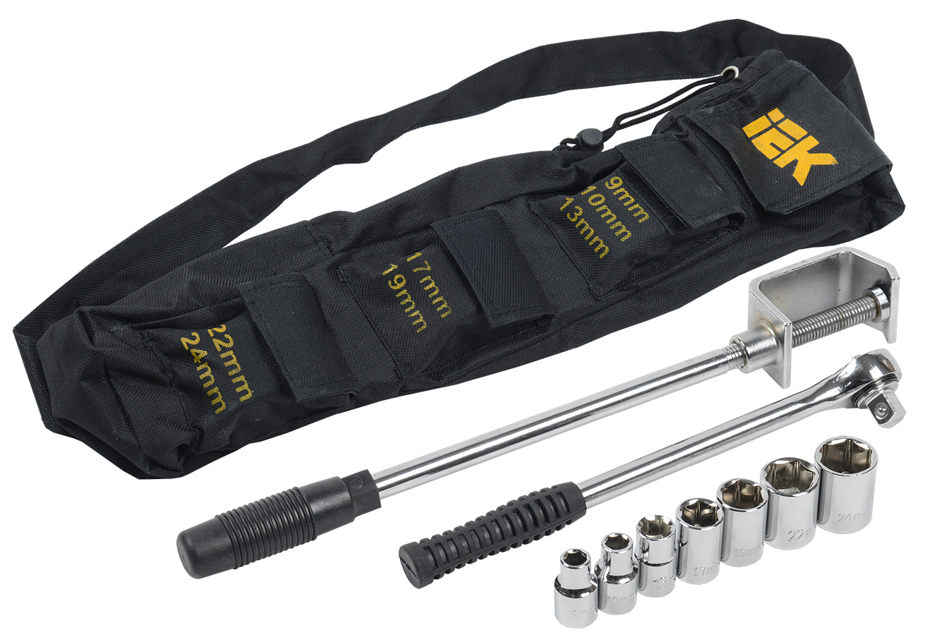 Набор состоит из струбцины, реверсивного трещоточного ключа и набора сменных головок. Струбцина применяется для фиксации изделий со срывными болтами. Возможно использование струбцины для разворота и ориентирования жил кабеля. Реверсивный трещоточный ключ и набор сменных головок позволяют осуществить монтаж с минимальными усилиями.